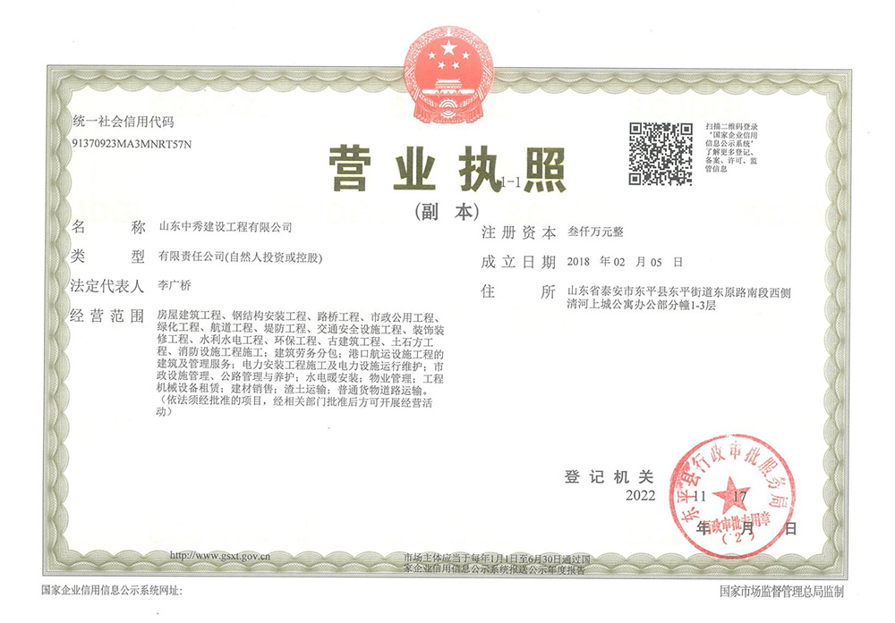 山东中秀建设工程有限公司成位于山东省泰安市东平县东平街道东原路南段东侧清河上城,公司主要经营房屋建筑工程、钢结构安装工程、路桥工程、市政公用工程、绿化工程、航道工程、堤防工程、交通安全设施工程、装饰装修工程、水利水电工程、环保工程、古建筑工程、土石方工程、消防设施工程施工;建筑劳务分包;港口航运设施工程的建筑及管理服务;电力安装工程施工及电力设施运行维护;市政设施管理、公路管理与养护;水电暖安装;物业管理;工程机械设备租赁;建材销售;渣土运输;普通货物道路运输。拥有建筑工程施工总承包叁级、市政公用工程总承包叁级、水利水电工程施工总承包叁级、环保工程专业承包叁级、钢结构工程专业承包叁级、施工劳务不分等级、消防设施工程专业承包贰级、防水防腐保温工程专业承包二级等多项资质及普通货物道路运输许可。